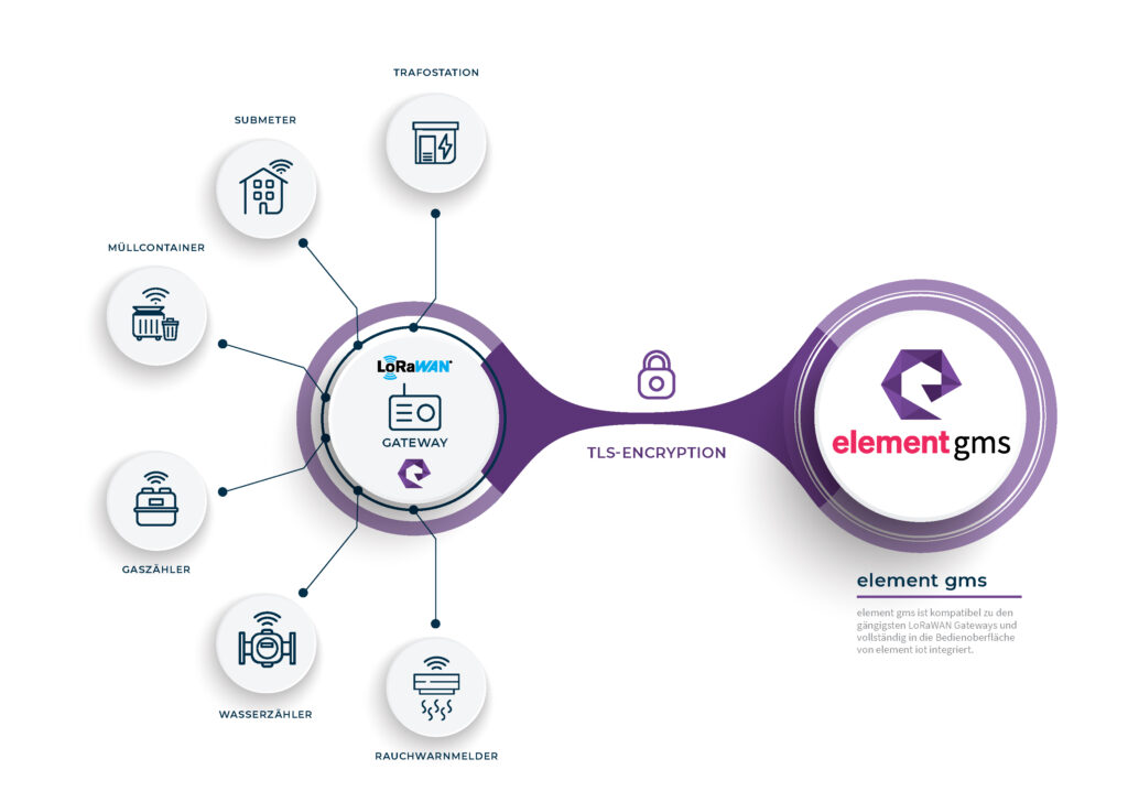 Auch das voll integrierte Gateway-Management- System element gms wurde verbessert. Mit dieser Komponente können Gateways jeglicher Hersteller bequem überwacht, aktualisiert, konfiguriert und entstört werden. element gms ist kompatibel mit den gängigsten LoRaWAN®-Gateways und vollständig in die Bedienoberfläche von element iot 4.0 integriert. Die Prozesssteuerung erkennt automatisch Störungen und versendet Alarme. Mit Hilfe von Remote-Konfigurationstools lassen sich Entstörungsmaßnahmen einleiten. Die Kommunikation zwischen den Gateways und element gms erfolgt TLS-verschlüsselt.